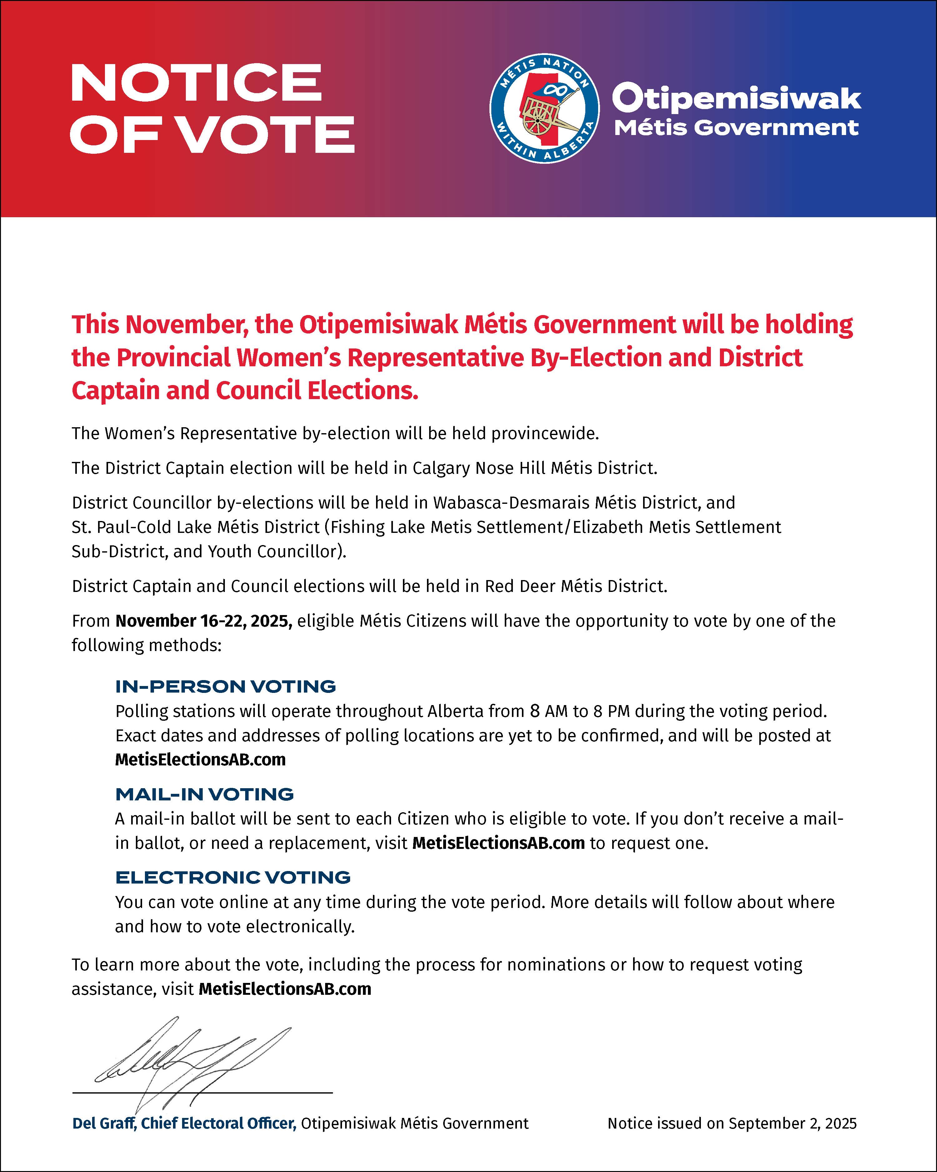 Chief Del Graff continues to serve as the Chief Electoral Officer for the Otipemisiwak Métis Government.