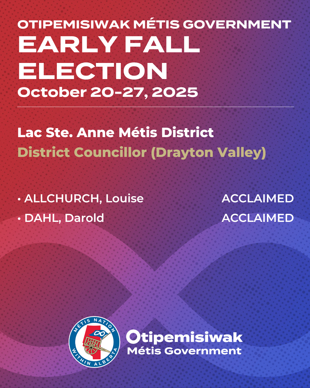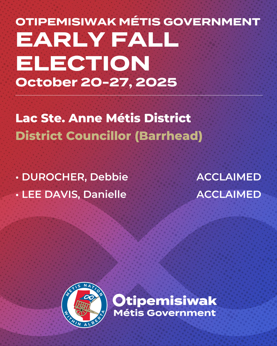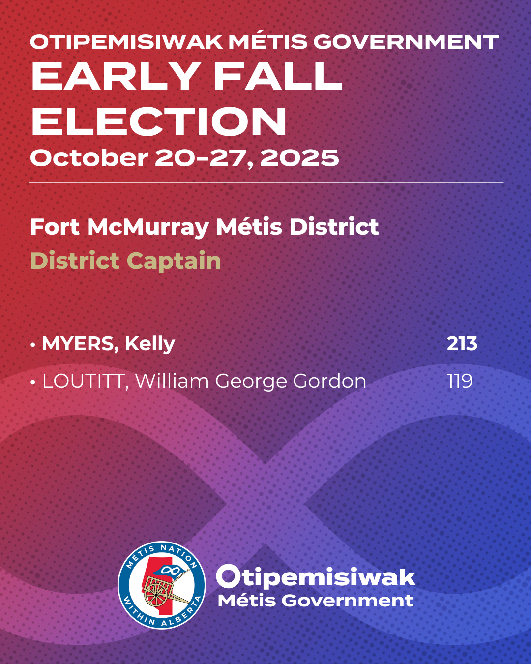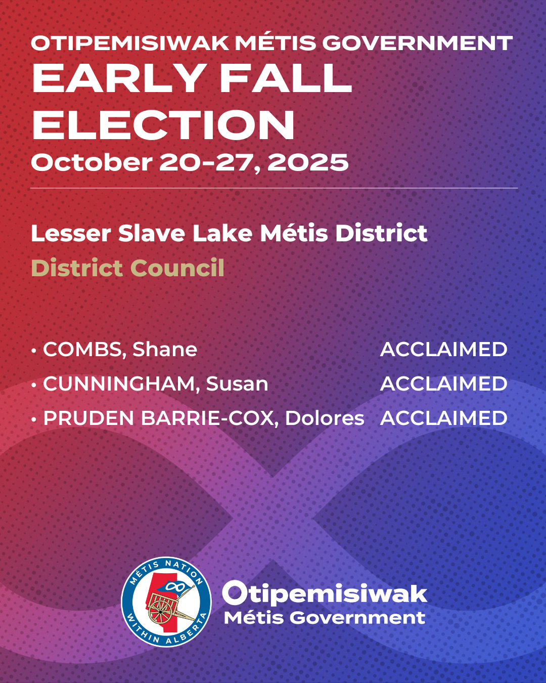 The Chief Electoral Officer has certified the 2025 Early Fall Election results for the Lac Ste. Anne Métis District, Fort McMurray Métis District, and Lesser Slave Lake Métis District Captain and Council Elections.