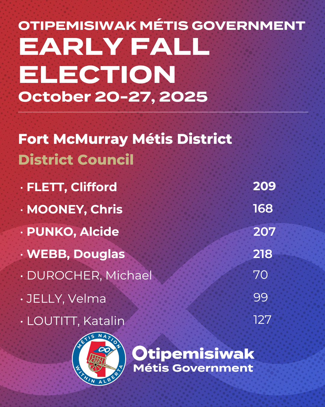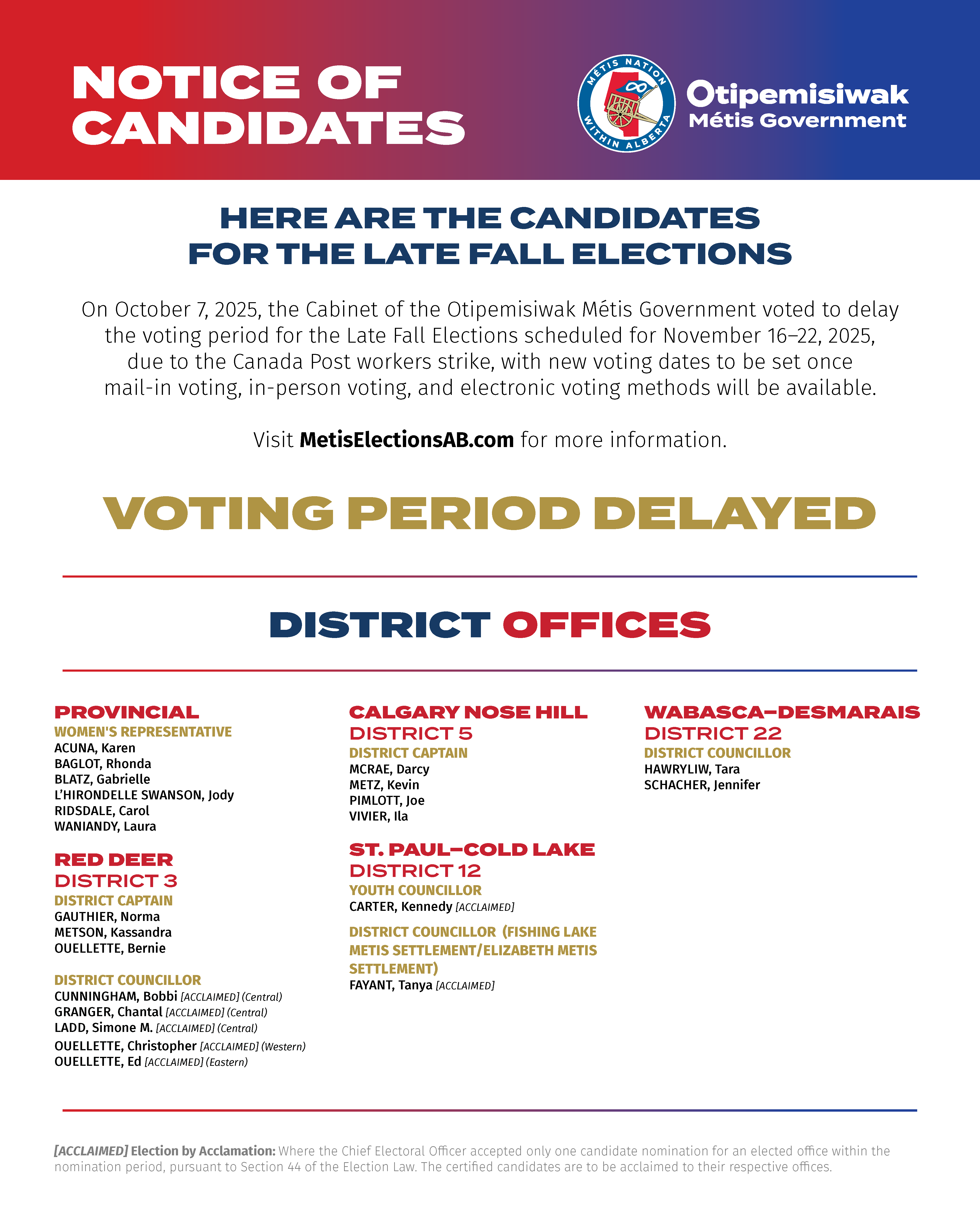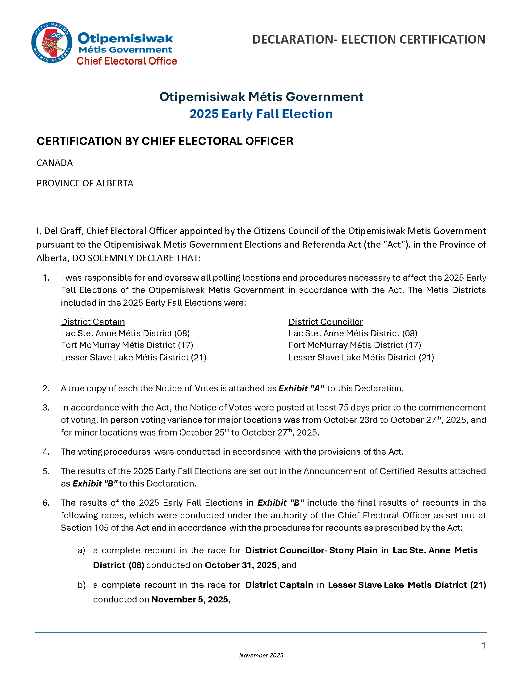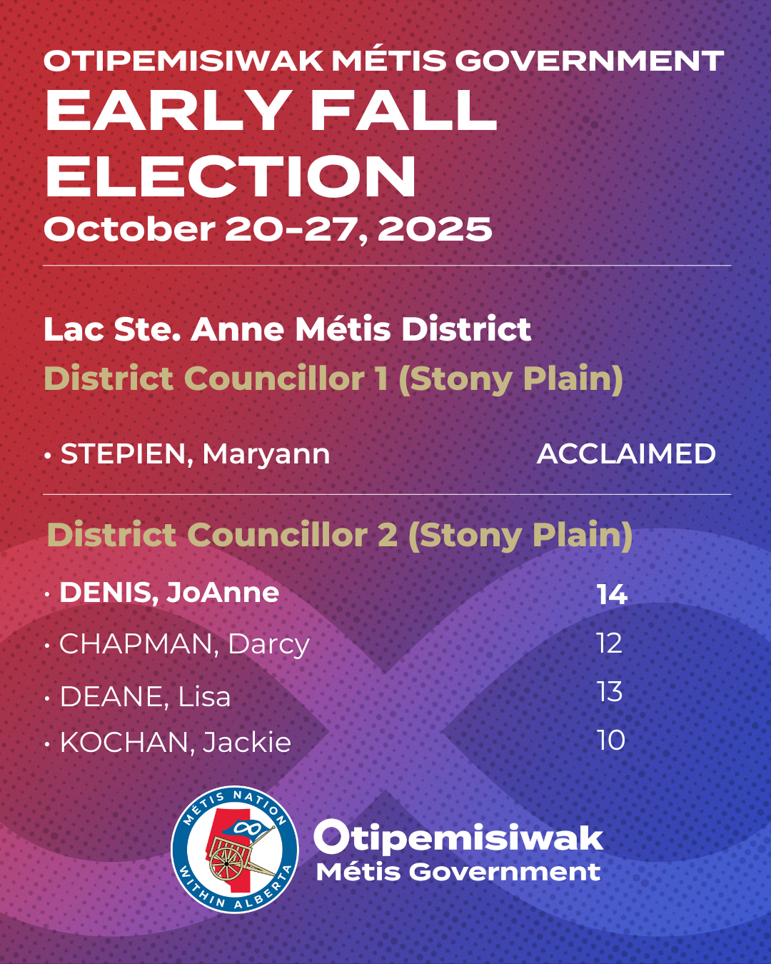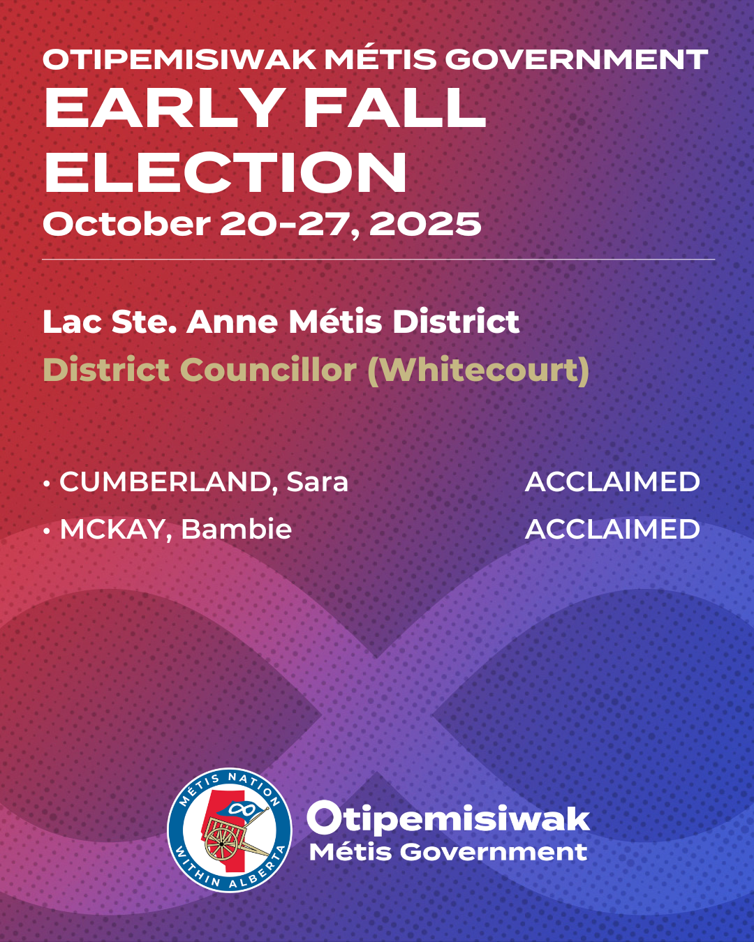 The Chief Electoral Officer has certified the 2025 Early Fall Election results for the Lac Ste. Anne Métis District, Fort McMurray Métis District, and Lesser Slave Lake Métis District Captain and Council Elections.