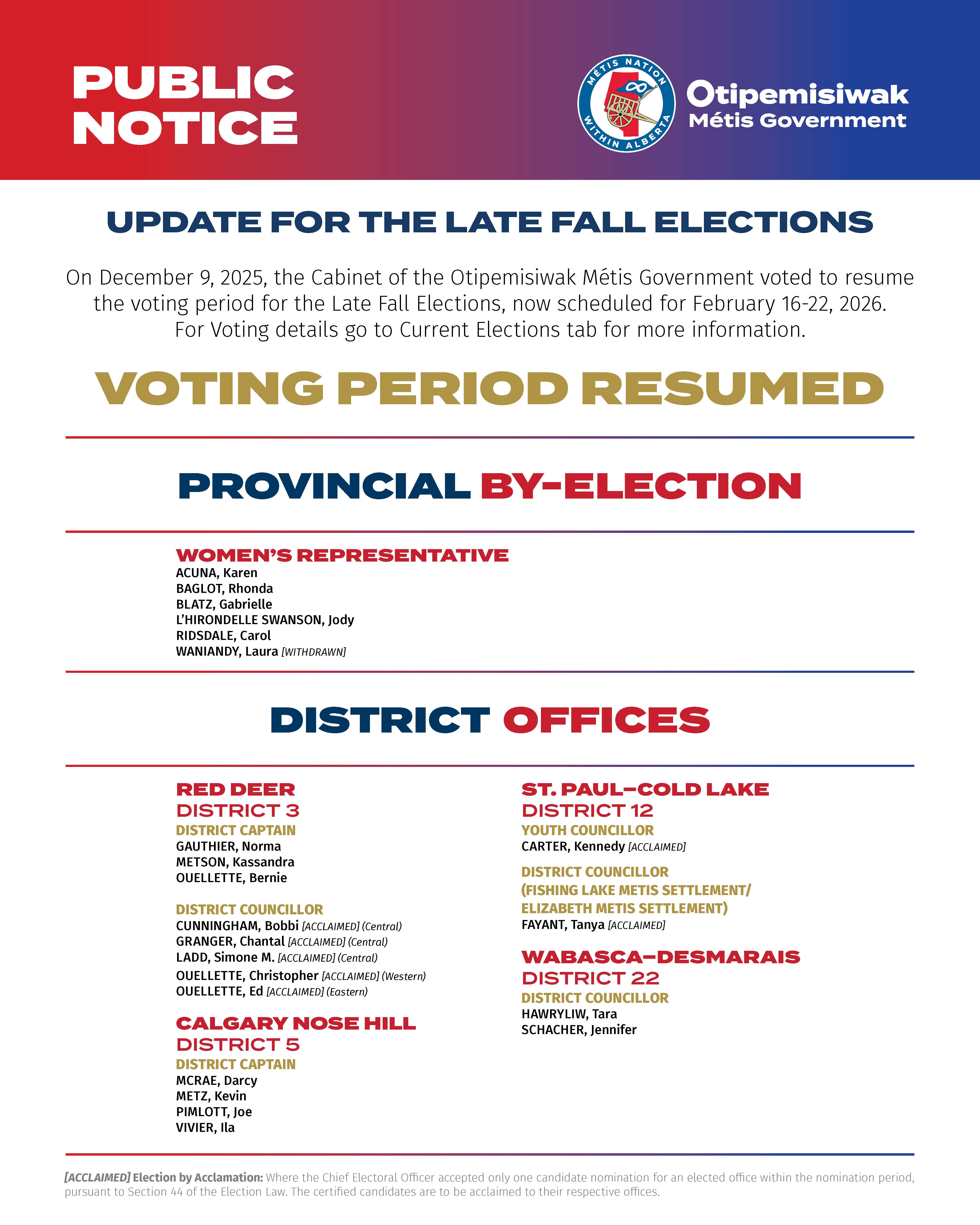 The Chief Electoral Officer has issued a Public Notice announcing the confirmed candidates running in the 2025 Late Fall Elections, as well as changes to the voting period due to Canada Post labour issues and disruptions to mail service.