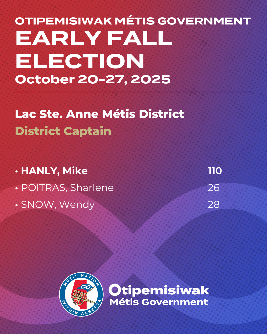 Preliminary results for the 2025 Early Fall Elections for the Lac Ste. Anne Métis District, Fort McMurray Métis District, and Lesser Slave Lake Métis District Captain and Council Elections are in.
