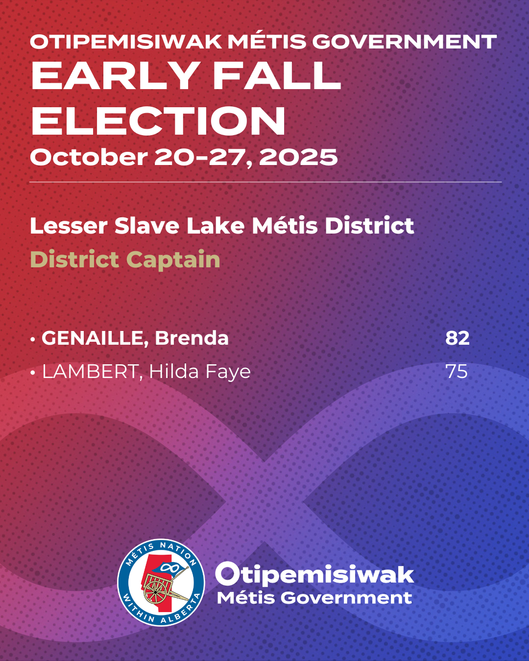 The Chief Electoral Officer has certified the 2025 Early Fall Election results for the Lac Ste. Anne Métis District, Fort McMurray Métis District, and Lesser Slave Lake Métis District Captain and Council Elections.